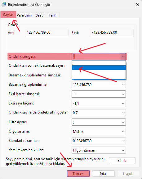 ► "Ondalık simgesi:" sekmesinde bulunan açılır listeden nokta(.)yı seçerek Tamam butonuna tıklayın.